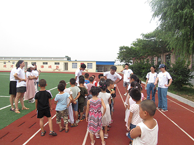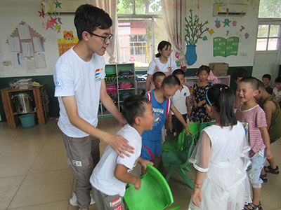 走进大班,小朋友们才刚刚午休结束,地上的小床杂乱地摆放着,志愿者们首先帮小朋友把睡觉的小床搬回了位置。恰逢阴天,凉风拂面,“今天我们去室外活动好不好?”听到志愿者说要去室外做游戏,小朋友们午睡后的慵懒一扫而空,互相兴奋地讨论着要做的游戏。在志愿者的带领下,小朋友们排成了长列走进操场,按人数平均分为三组,每一组在两到三位志愿者的看护下进行“老鹰捉小鸡”的游戏,孩子们在操场上纵情奔跑着、嬉笑着,快乐的笑声填满了偌大的校园。在这个游戏结束后,小朋友们又回到教室,开始了“抢凳子”的游戏。志愿者们把26个小朋友分为两组,每当一个小朋友离开比赛,另一组在后面观看的小朋友就会自发地为这位小朋友挪出一个位置。随着人数的减少,小朋友们的欢呼声也愈发高涨,最后决出冠军、由志愿者向冠军小朋友颁发贴画奖品时,所有的孩子都为这位优胜者鼓着掌,由衷地祝贺着他们间的这位小小冠军。