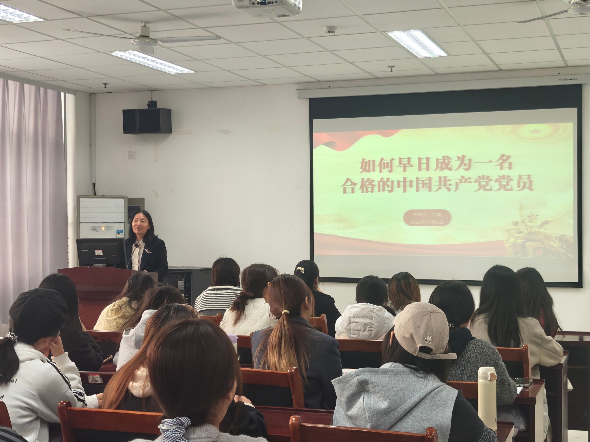 学院党委书记卢琦,党委副书记、副院长冯潍,副院长李开云和杨鹏,组织员张宝华为学员们讲授专题党课。卢琦围绕“如何早日成为一名合格的中国共产党党员”展开讲授,通过对比党员权利义务与日常行为规范,引导学员明确自身差距。她提出“思想入党、行动入党、组织入党”的实践路径,鼓励学员在学习生活中主动发挥先锋模范作用,以坚定理想信念筑牢精神之基,把对党忠诚融入血脉、付诸行动。